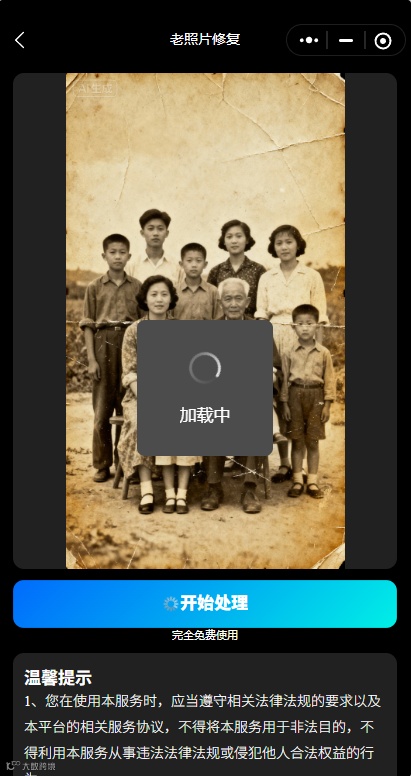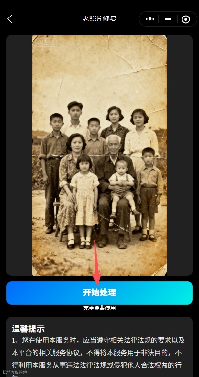 首先,打开AI换脸视频照片神器小程序,点击下方“工具箱”,再点击“老照片修复”,接着点击“选择图片”,上传一张你要修复的照片;点击“开始处理”,等待处理成功;成功之后,就可以点击“保存”,去可以在相册里查看啦。