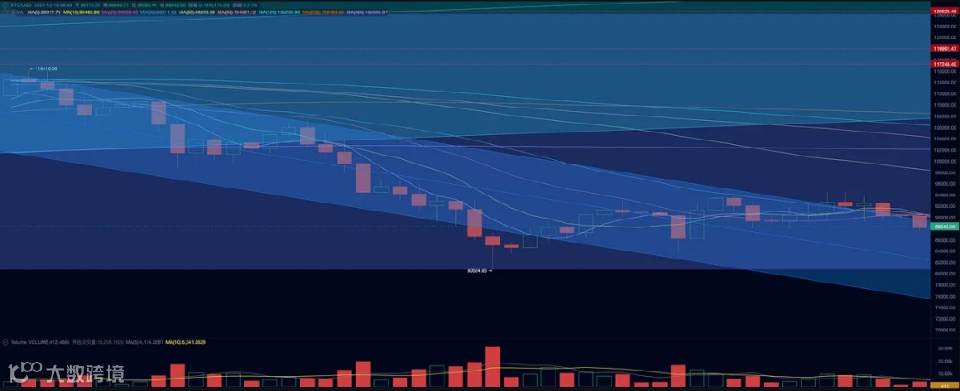 本周BTC开于90402.30美元,收于88171.61,跌幅幅2.47%,振幅7.83%,成交量小幅萎缩。技术上,BTC在降息前一度突破下降趋势通道,但之后受AI股财报冲击,尽数回吐。