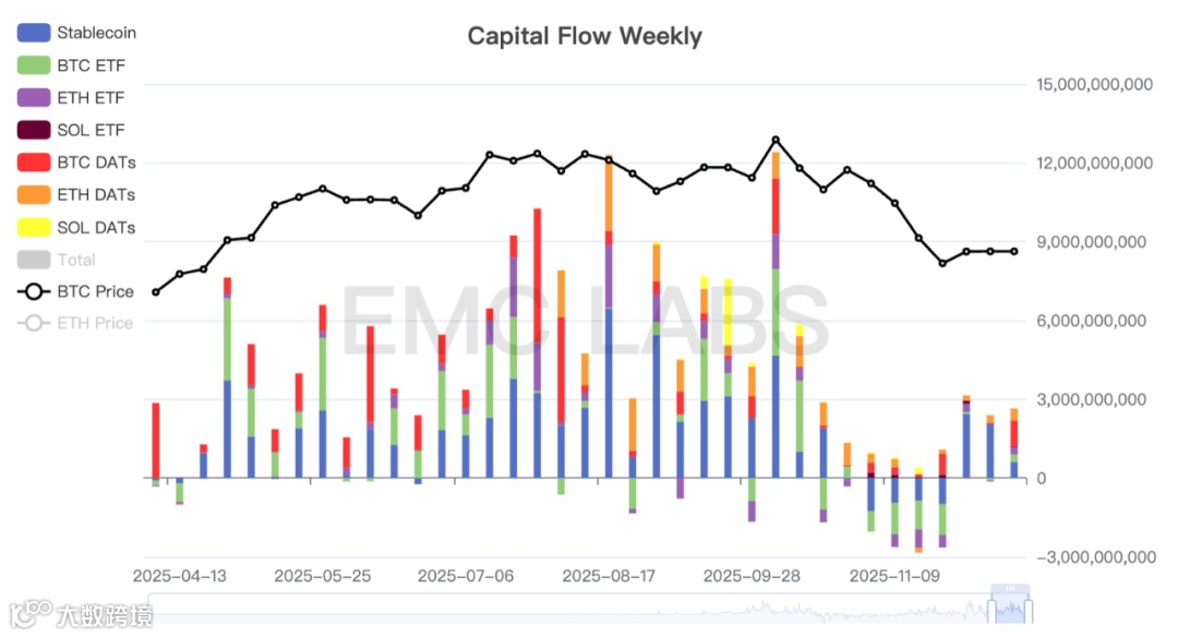 资金方面,情形相对乐观。已统计数据显示,本周流入资金并未明显变化,但在上周Strategy进行了超9亿美元的BTC增持,Bitmine亦大幅增持ETH,这对市场信心无疑有大幅提振。