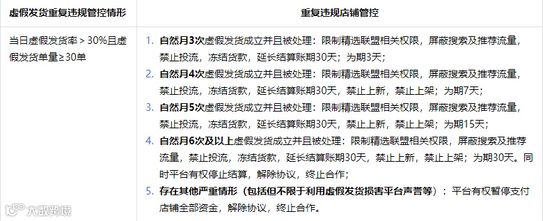 - 平台按日统计虚假发货行为,视情况采取扣违规积分、冻结货款等措施;