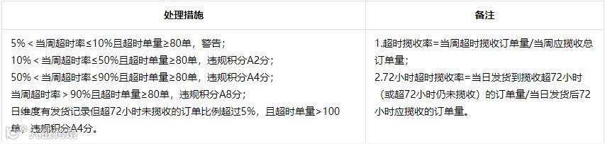 - 平台按周及日维度统计揽收超时情况,视情节采取警告、扣违规积分等措施;