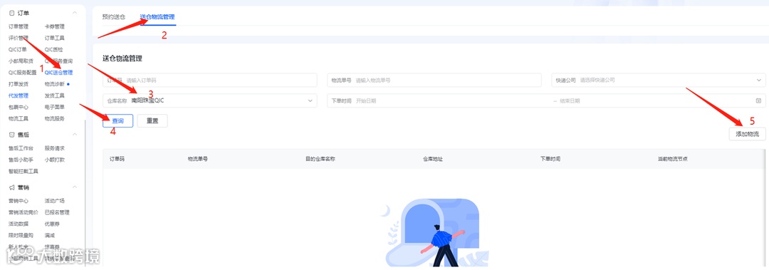 (3)点击“查询”,选择待添加物流的订单,填写物流公司及快递单号,确认保存。