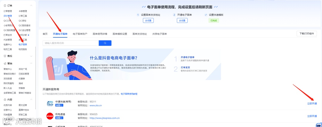 操作前提:商家需在抖店后台“电子面单”功能中开通快递服务。建议优先选择京东、顺丰,审核通过速度较快。