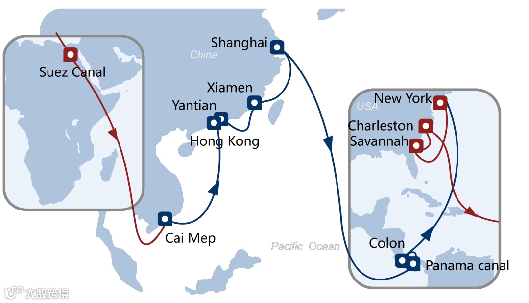 l 东行航线需要经过太平洋,然后通过巴拿马运河到达大西洋再到美东萨凡纳港口。
