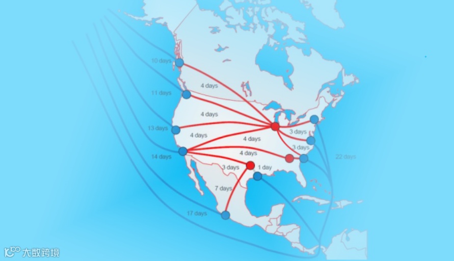 由于电商货物对于物流时效的高要求,所以发往美东的货物,有很大的一部分会选择在美西港口卸船清关,然后通过快递、卡车、铁路等运输方式再将货物送达美中、美东的目的地仓库。