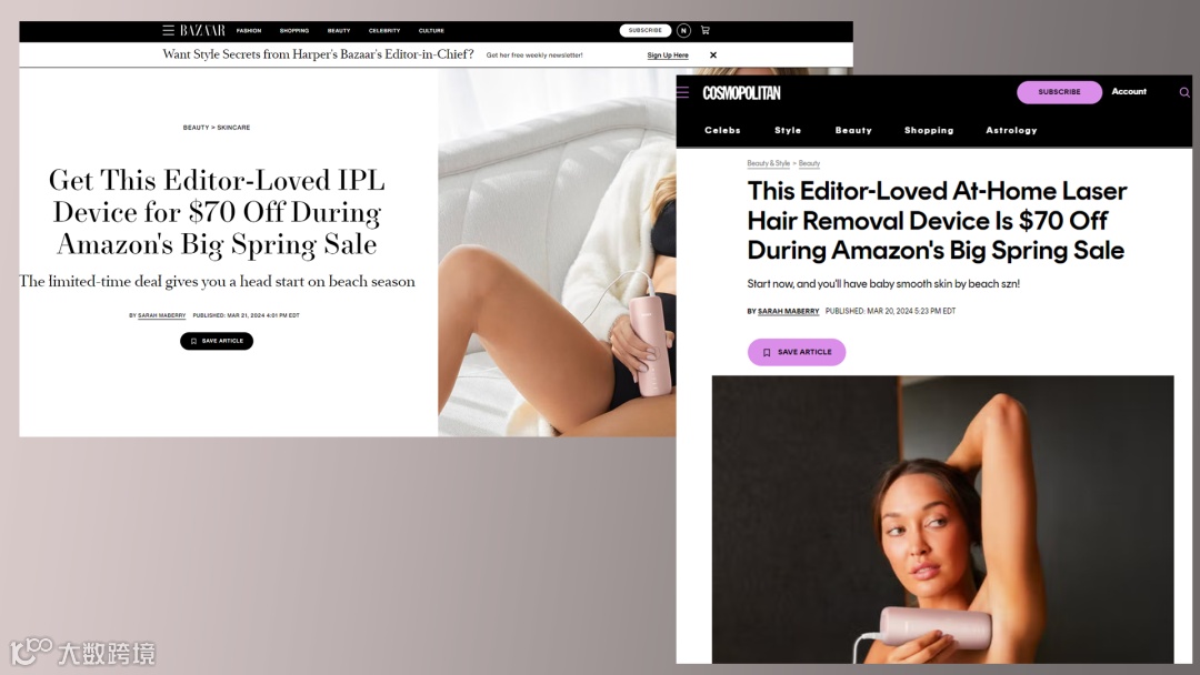 结合购物季等大促节点,消费热情高涨时机发布折扣信息,能切实帮助销量增长跑出加速度。2024年春季大促,Ulike选择BAZAAR,COSMOPOLITAN等知名时尚媒体发布折扣促销稿件。