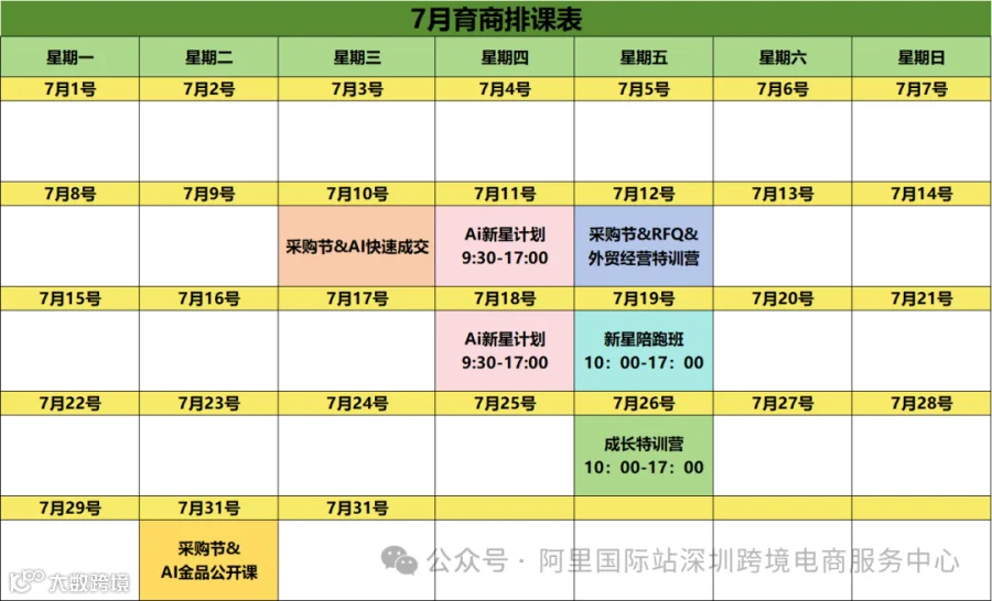 阿里国际站深圳跨境电商服务中心七月育商排期及活动海报