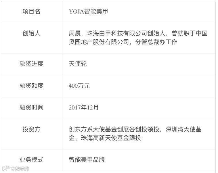 近日,YOJA智能美甲创始人周晨向铅笔道透露,公司已完成400万元天使轮融资,投后估值4000万元。本轮融资由创展谷创投领投、深圳湾天使基金、珠海高新天使基金跟投,资金将主要用于市场拓展和模式复制。