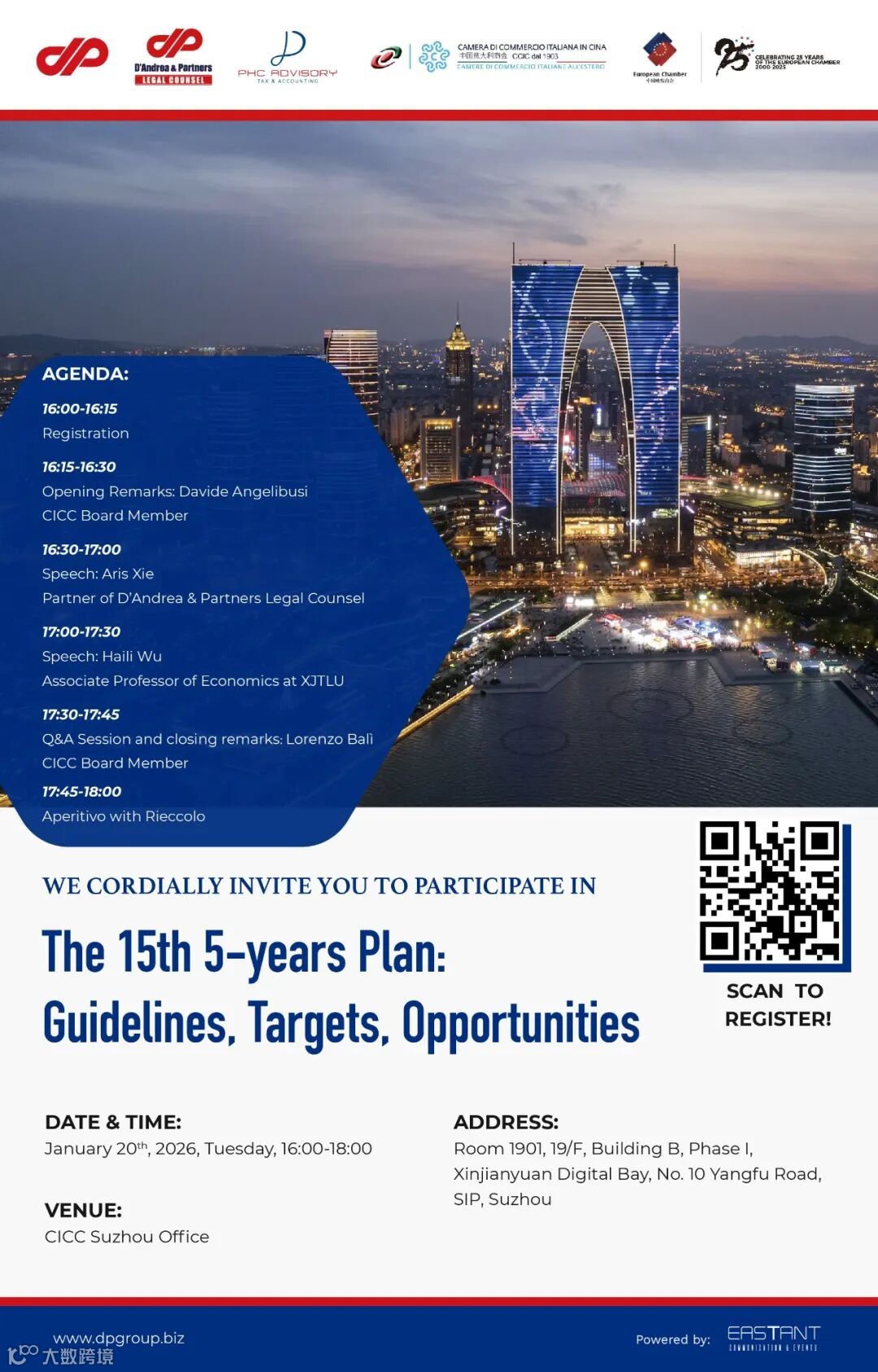 To address these priorities, D'Andrea & Partners, PHC Advisory, Camera di Commercio Italiana in Cina (CICC), and European Union Chamber of Commerce in China (EUCCC) are pleased to co-host a seminar: "The 15th 5-years Plan: Guidelines, Targets, Opportunities" on January 20th, 2026, in Suzhou.