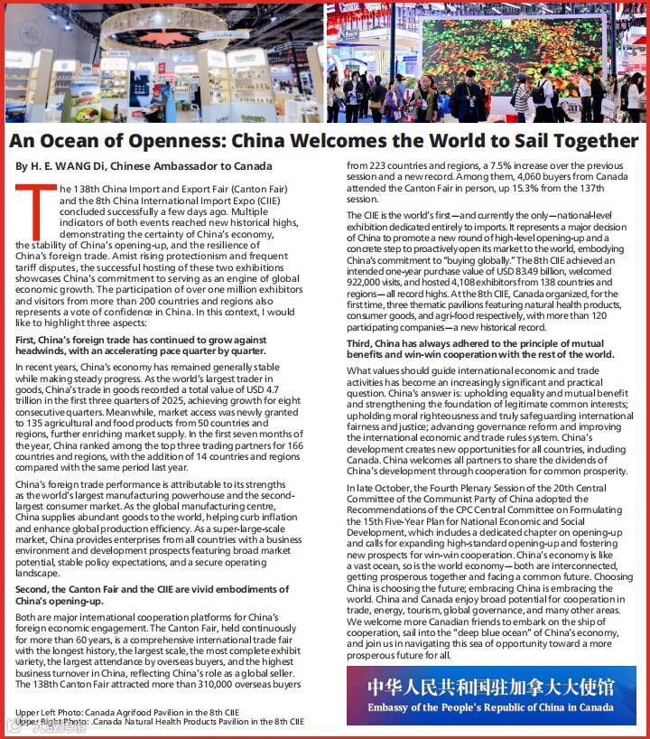 In late October, the Fourth Plenary Session of the 20th Central Committee of the Communist Party of China adopted the Recommendations of the CPC Central Committee on Formulating the 15th Five-Year Plan for National Economic and Social Development, which includes a dedicated chapter on opening-up and calls for expanding high-standard opening-up and fostering new prospects for win-win cooperation. China’s economy is like a vast ocean, so is the world economy—both are interconnected, getting prosperous together and facing a common future. Choosing China is choosing the future; embracing China is embracing the world. China and Canada enjoy broad potential for cooperation in trade, energy, tourism, global governance, and many other areas. We welcome more Canadian friends to embark on the ship of cooperation, sail into the “deep blue ocean” of China’s economy, and join us in navigating this sea of opportunity toward a more prosperous future for all.