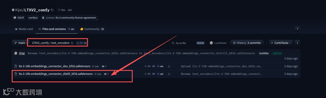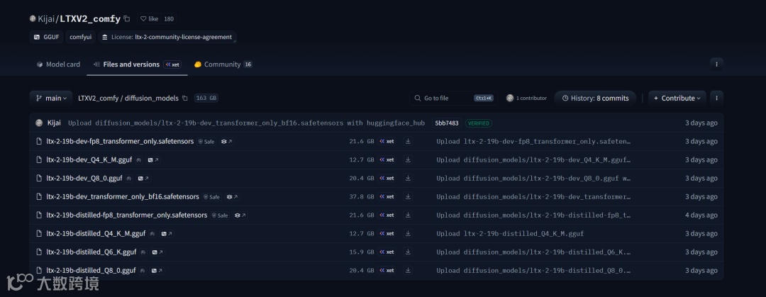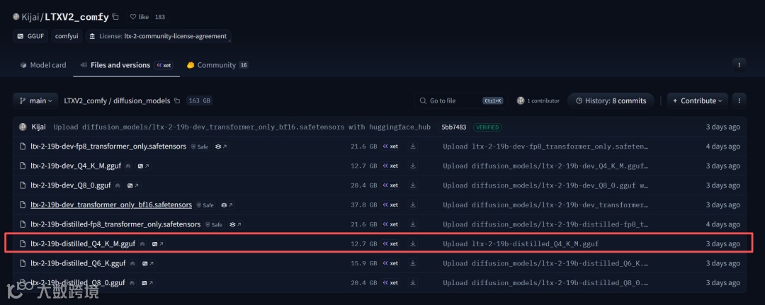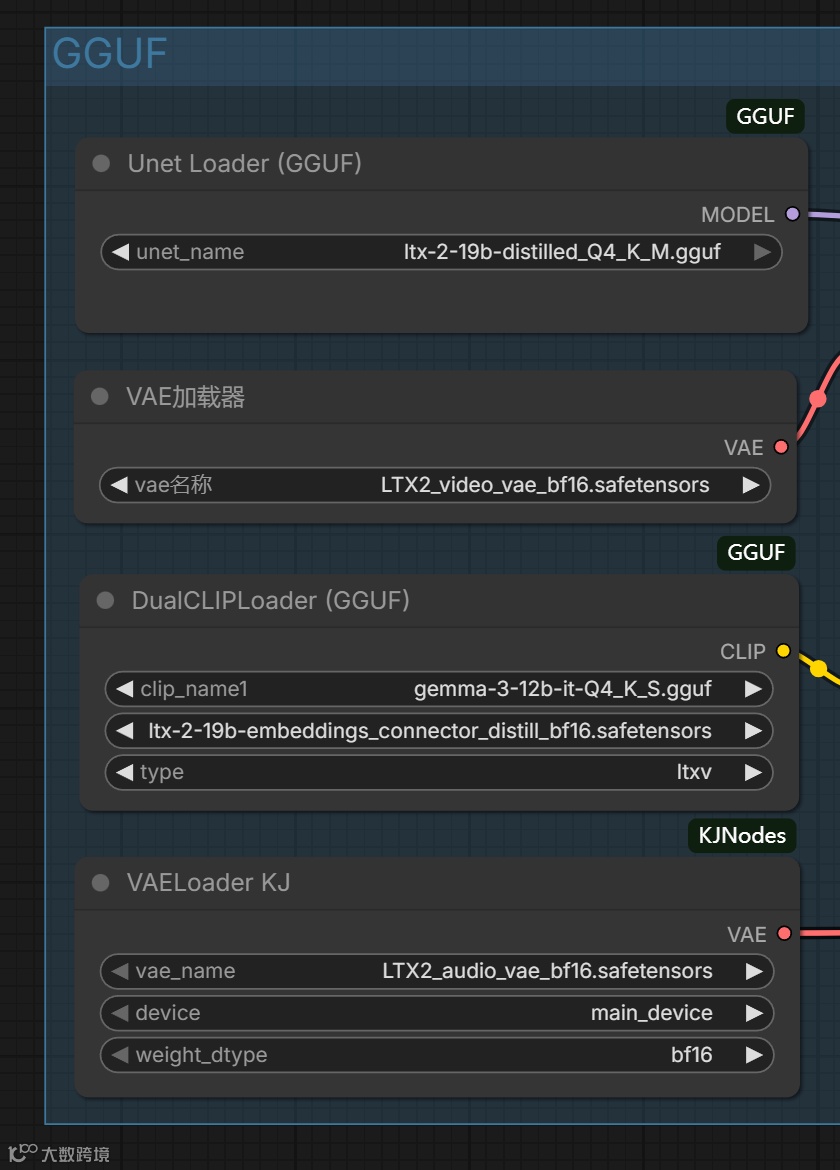 首先,主模型选择。LTX-2本身就提供了蒸馏版模型,所以,低显存就直接选择蒸馏版的模型,但不是使用官方的,而是GGUF量化后的蒸馏模型。KJ大佬在抱脸库上其实已经提供了:https://huggingface.co/Kijai/LTXV2_comfy/tree/main/diffusion_models