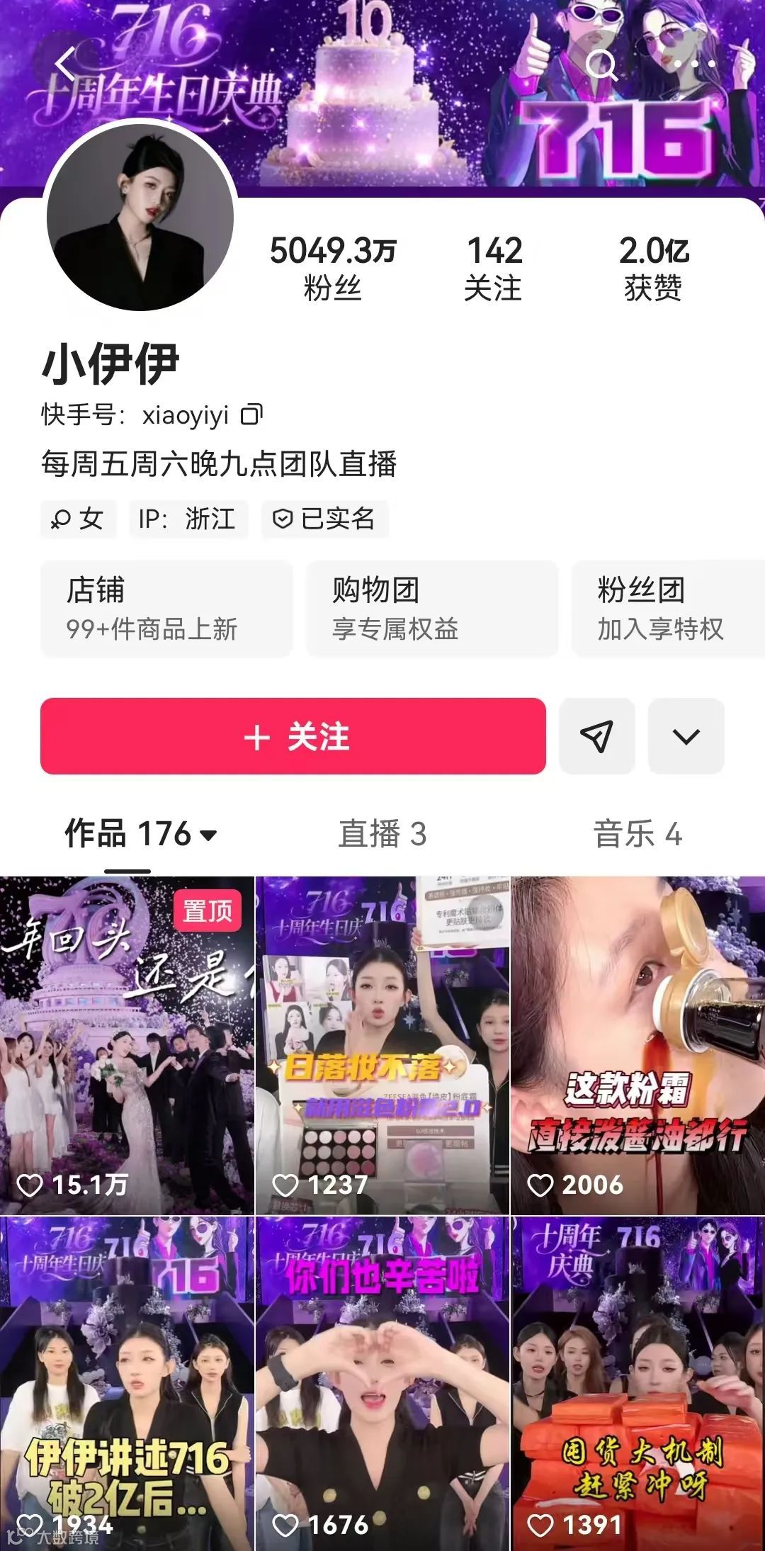 近年来,小伊伊凭借怀旧热度重获关注,在抖音积累数百万粉丝,并在快手持续开展直播带货。2023年双11期间,其直播间销售额破亿;2024年7月单场销售额超2亿元。