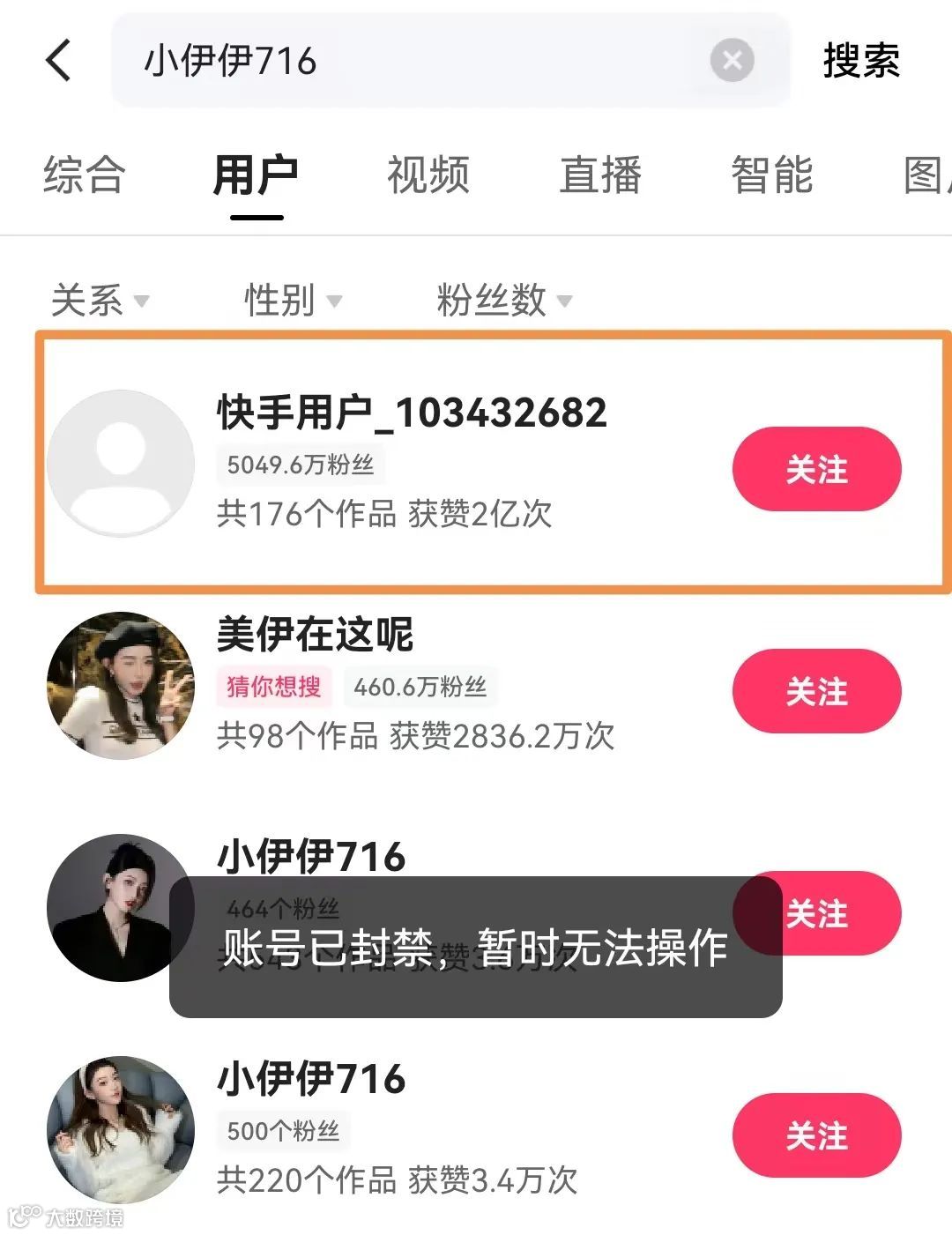 近日,拥有超五千万粉丝的快手头部主播小伊伊账号出现异常,页面显示“账号已封禁,暂时无法操作”,头像消失,用户名变更为“快手用户+编号”。其丈夫、同为网红的牌牌琦(@李石榴)账号也遭遇类似情况。