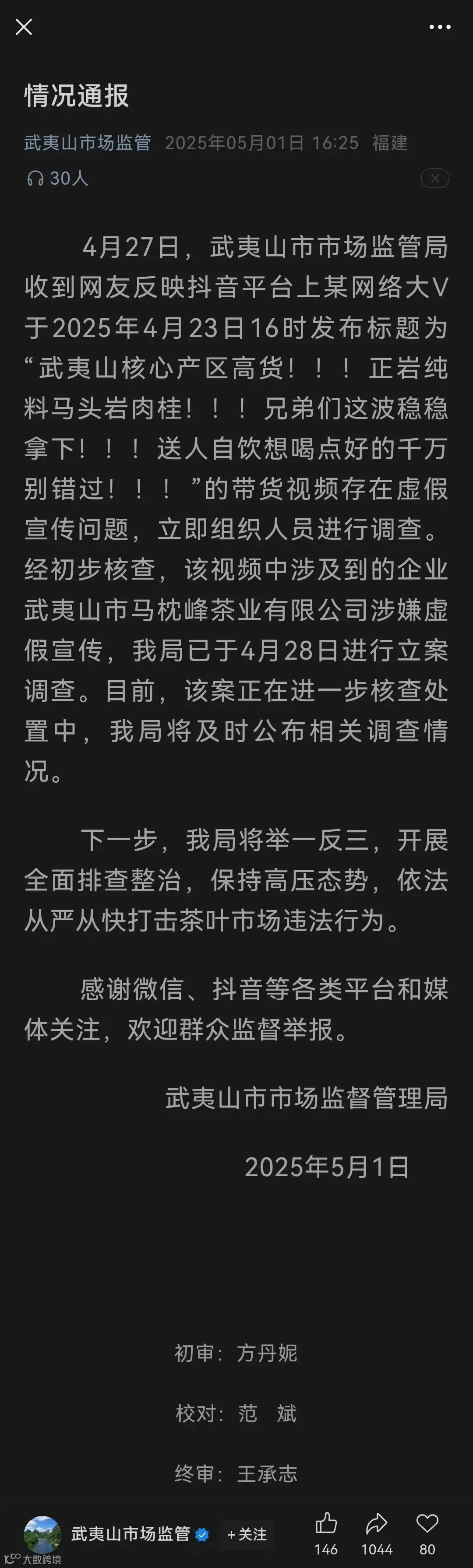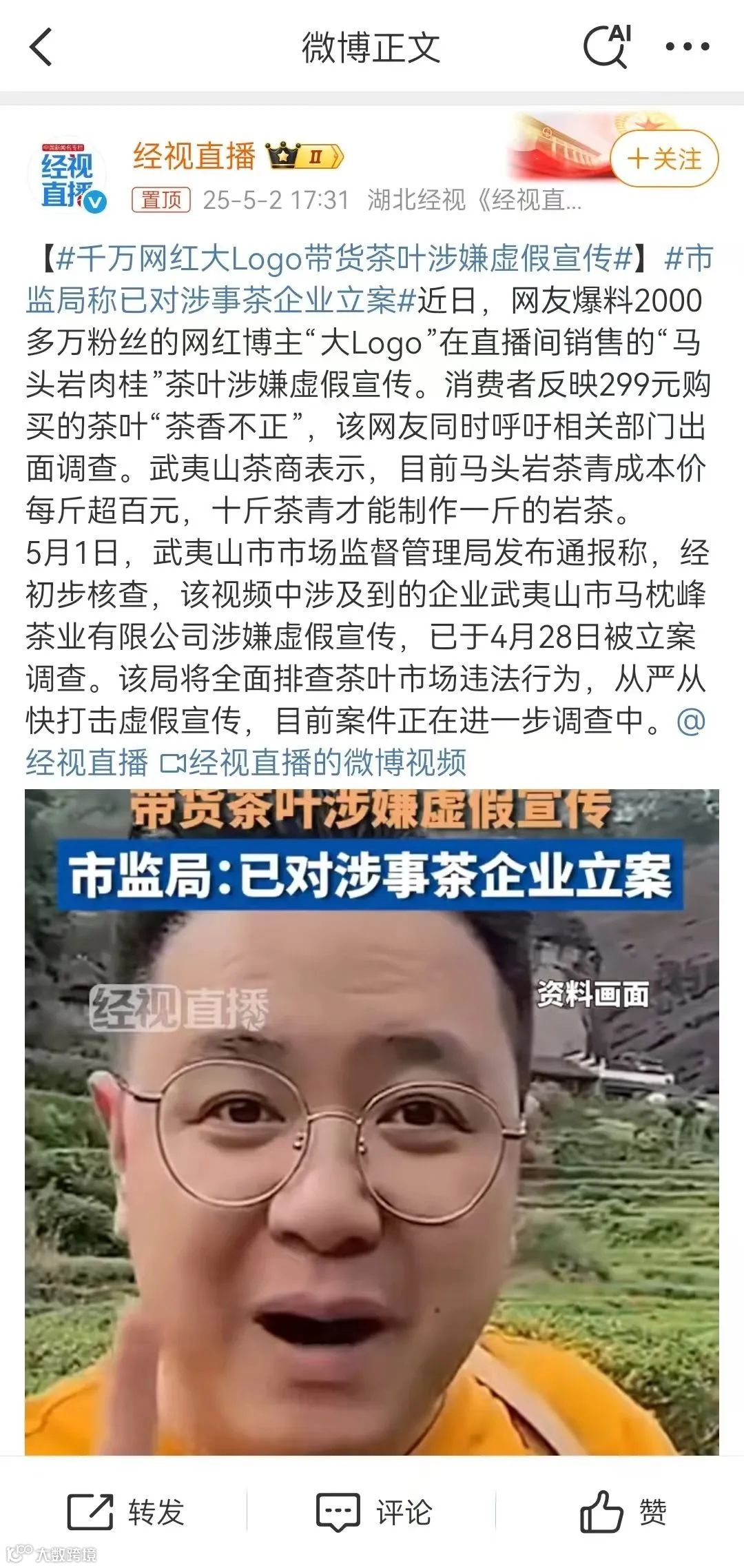 近期,千万粉丝级网红大LOGO在抖音推广“马头岩肉桂”茶叶时,宣称“武夷山核心产区高货”,却被消费者质疑品质不符、价格异常偏低。武夷山市市场监管局已介入调查,涉事公司涉嫌虚假宣传。