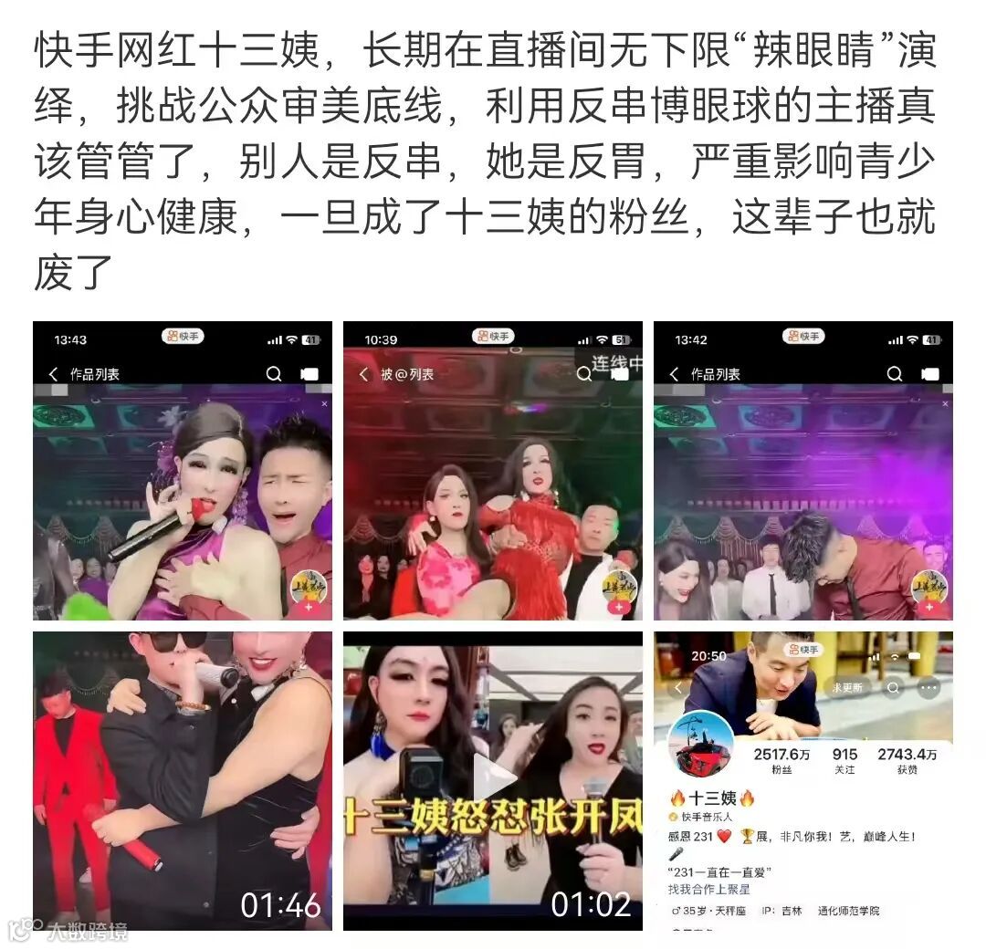 值得注意的是,十三姨系男性博主男扮女装走红,其夸张妆容与前卫穿搭虽带来高关注度,但也被部分网友批评为“低俗”“博眼球”。其直播间融合才艺表演与商品推广,虽增强互动体验,但内容风格争议不断。