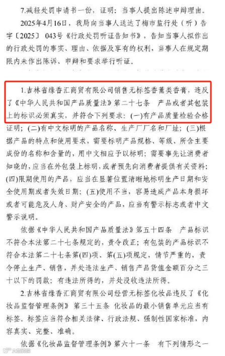 执法部门认定,当事人具有主观故意,但鉴于其配合调查、成交量较小且已及时下架相关产品,违法行为轻微。最终依据货值金额进行处罚:香薰类产品按20%比例罚款,化妆品类按3倍罚款。