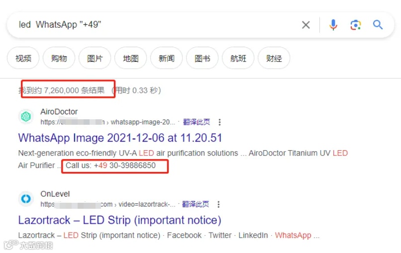 这个指令的意思是搜索某个社媒里面某个国家做某个产品的WhatsApp账号,比如这个指令就是搜索Facebook里面德国做led产品的WhatsApp号码,依次类推可以搜索linkedin、Twitter、instagram等等,其他的自己去尝试,如下图