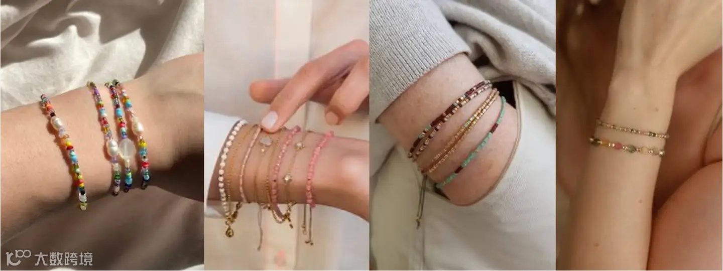 在自制珠宝中,“小珠子手链”的搜索热度增长十分显著;根据Pinterest搜索结果来看,五彩斑斓的手链显然更受欢迎,流行的平直串珠制作起来十分简单,对材质也并无限制,所以图片多以戴在手上展示的方式呈现,而非制作教程。这对于材料包的销售是个很好的机会。