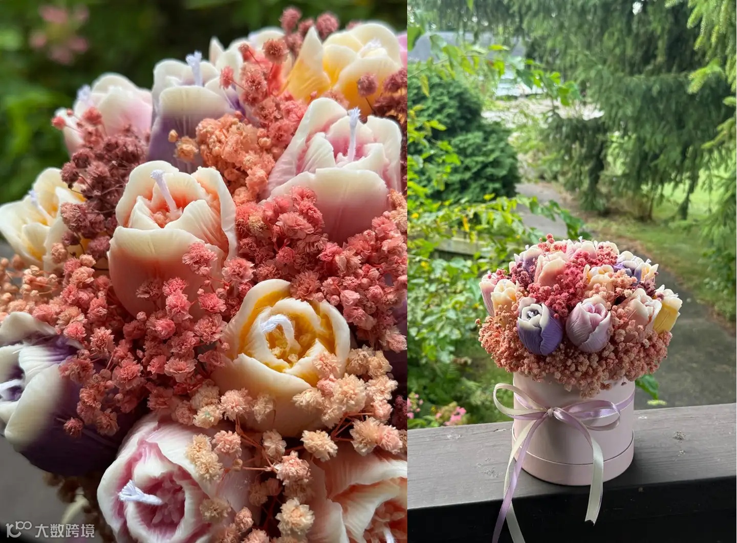 其次,值得注意的是蜡烛花束,它是众多热搜词汇中唯一有商品属性的词,且具有新奇特性——花朵造型的蜡烛被包装成花束的样子,可以当作室内香薰,也可以点燃使用。这款花束在Etsy售价约332元,支持定制花朵的品种、颜色和香味。