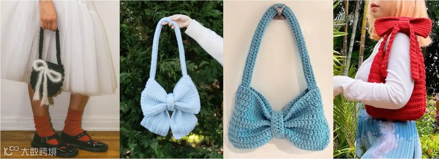 钩织蝴蝶结包是自制包袋中搜索热度增长最多的品,尽管这一词汇十分具体,但体现在商品上,还是有很多不同的款式;其中有部分款式明显需要复杂的制作过程,卖家可以考虑直接销售这类款式的成品。