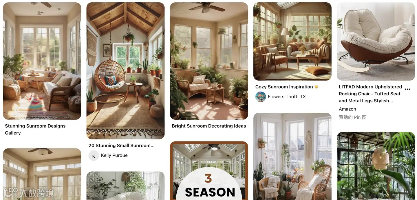 “温馨的阳光房”关键词的搜索量增长率高达930%,秋季气温降低,人们对阳光的态度由躲避转为迎接,使用阳光房的时间变长,装饰阳光房的意愿自然会上升。从Pinterest图集来看,构成“温馨”氛围的商品有绿植、抱枕、地毯和藤编装饰品,家居卖家在研究Pinterest引流教程时可以将这类商品作为秋季主推品,结合热搜关键词展开大力推广。