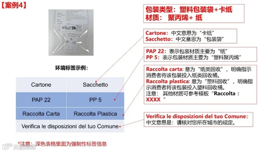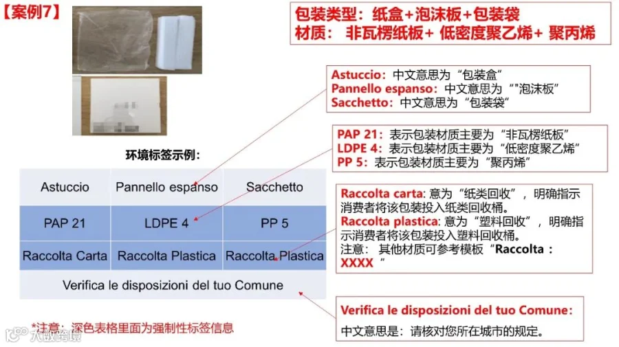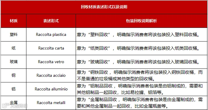 标注主要材料:如果包装的主要材料是塑料(比如铝塑复合包装),可以标注“Raccolta plastica”(塑料回收),特殊情况除外。