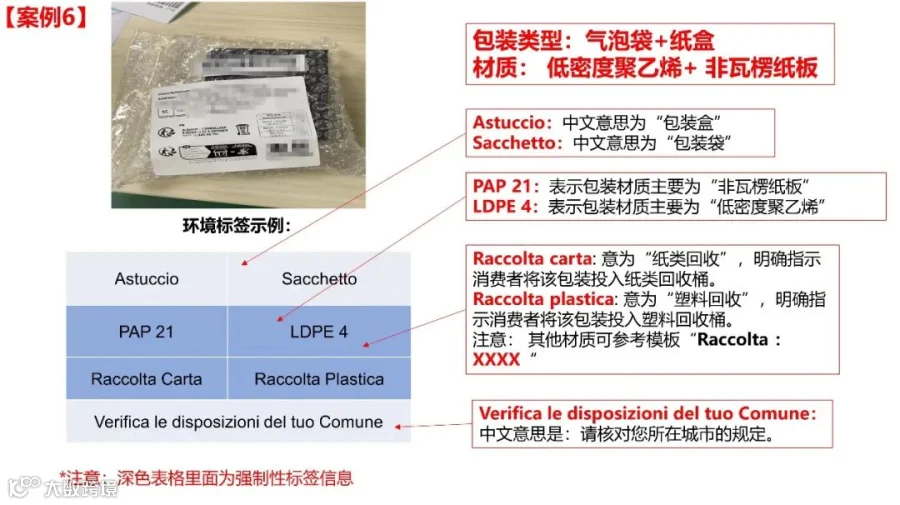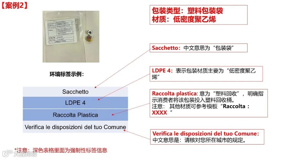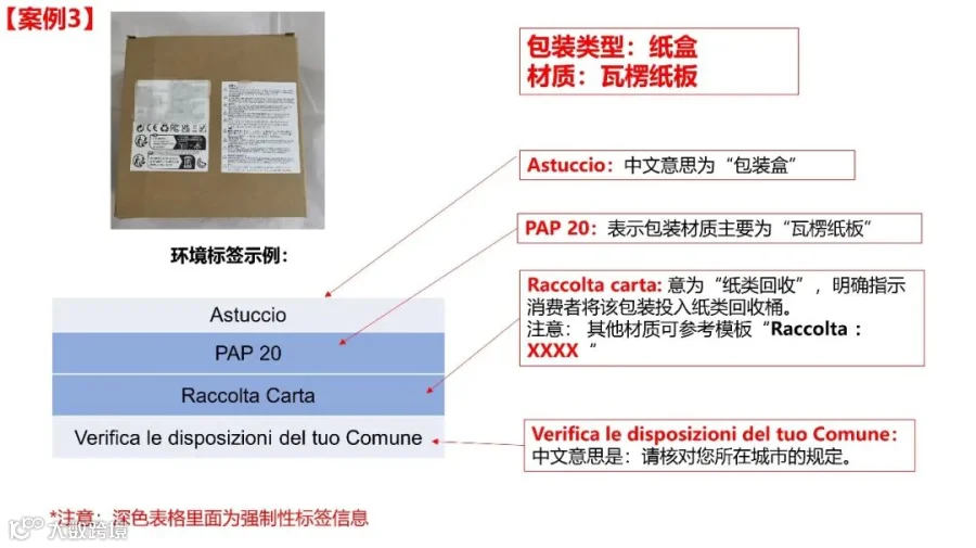 温馨提示:以上仅为商品包装标签的常见一般情况说明,仅供参考,并未穷尽意大利商品包装环境标签相关的所有要求。