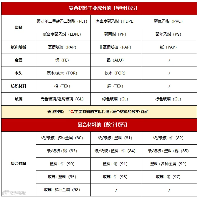如果包装只有一种材料(比如纸盒),那么就在包装上直接标注这个材料对应的字母和数字代码。
