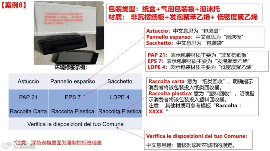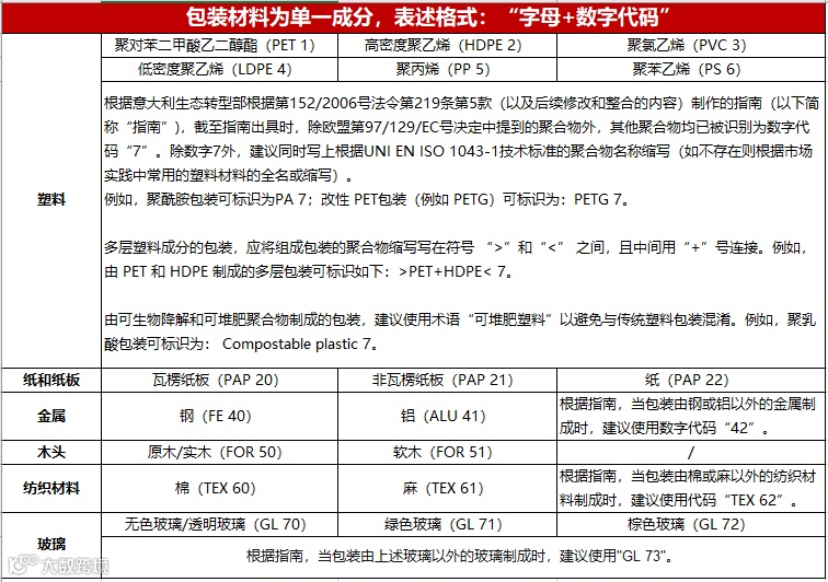 根据意大利包装法相关要求,应在商品包装上展示包装材料类型,以实现包装材料分类回收,保护环境。注意,商家需要区分包装材料是单一成分还是复合成分。