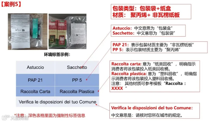 1. 意大利语标示:所有包装上的回收说明都必须使用意大利语。