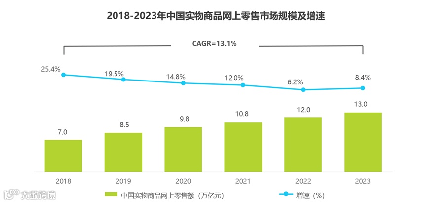 数据显示,2023年中国实物商品网上零售额达13.0万亿元,同比增长8.4%,但增速持续放缓,反映消费环境趋稳及流量红利见顶。