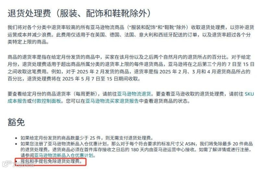 不过,从2025年5月15日起,亚马逊会正式取消背包和手提包等退货率较高品类的退货处理费。