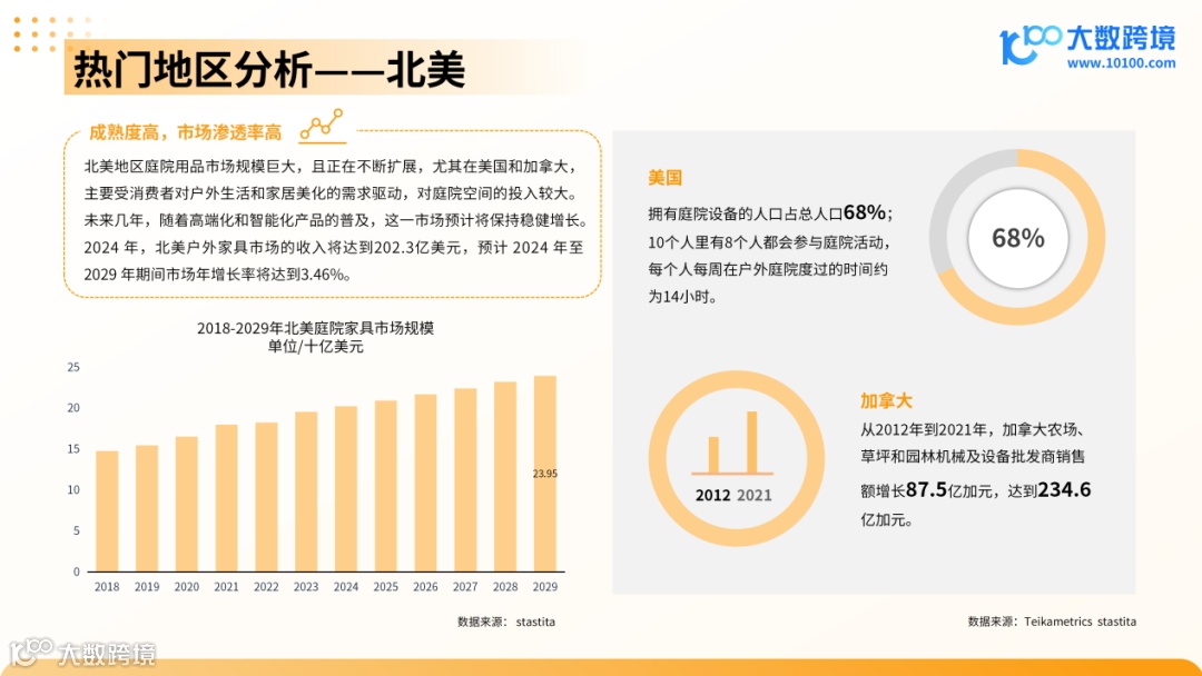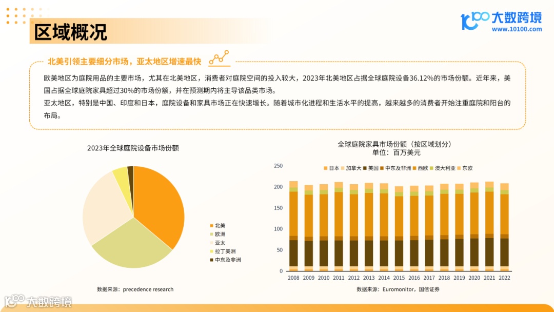 本片报告对北美、欧洲、亚太三个地区的进行了系统分析。想要获取全部内容,可以关注【大数跨境】公众号,回复【2024全球庭院用品市场洞察报告】免费下载原报告,查看完整版。
