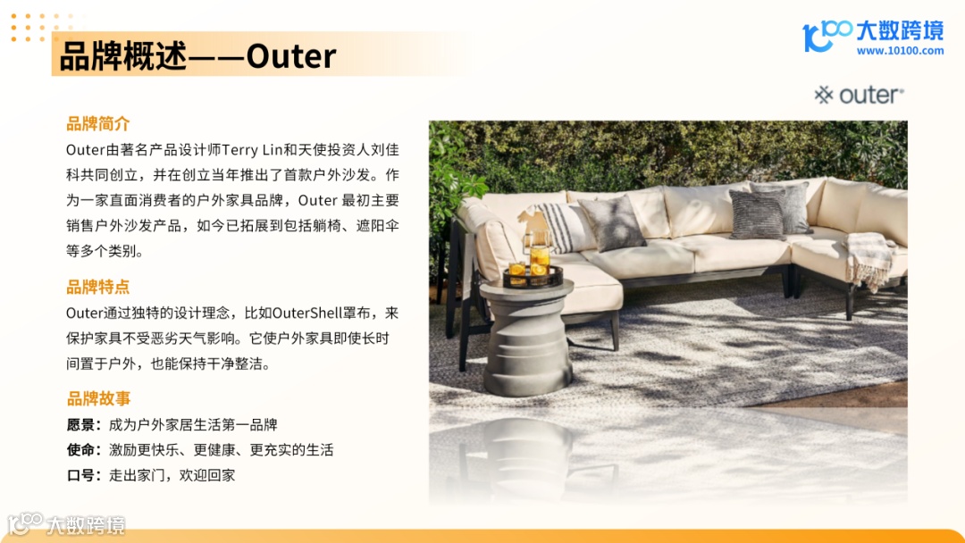 Outer由著名产品设计师Terry Lin和天使投资人刘佳科共同创立,并在创立当年推出了首款户外沙发。作为一家直面消费者的户外家具品牌,Outer最初主要销售户外沙发产品,如今已拓展到包括躺椅、遮阳伞等多个类别。