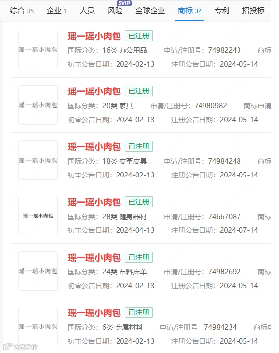 更值得关注的是,“瑶一瑶小肉包”商标已被多方抢注,涵盖服装、医药、通讯等领域,其本名“杨亦瑶”亦成为商标争夺对象。