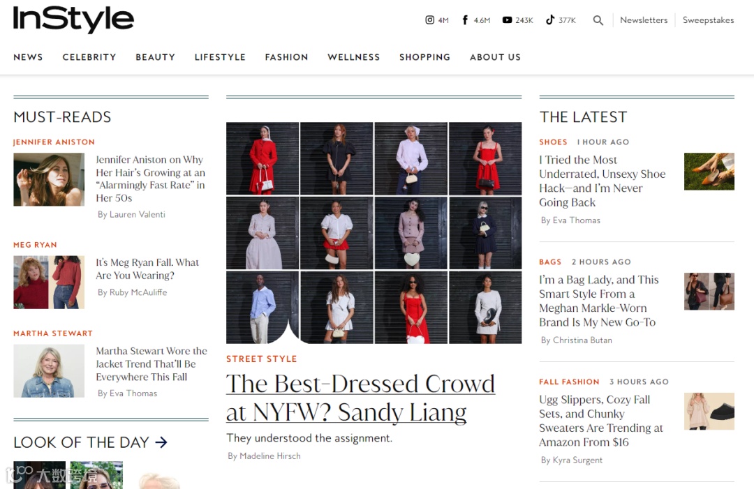 Instyle虽然不如其他传统时尚杂志知名度高,但其专业性同样无可比拟。创刊于1994年,是一份美国月刊女性时尚杂志。2022年,Instlyle停止出版杂志转为纯线上格式。内容涵盖美容、时尚、家居、名人故事和女权主义。相比Vogue、ELLE的高度聚焦时尚内容,Instyle的风格更泛,受众圈也更广。