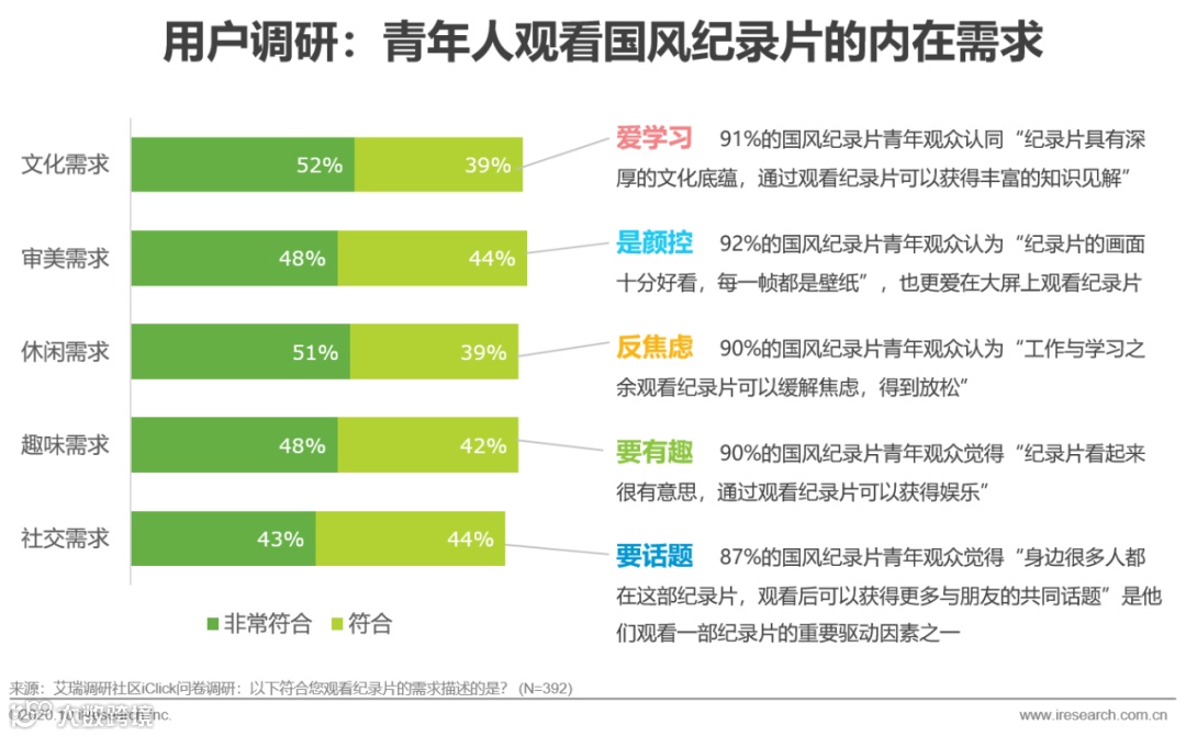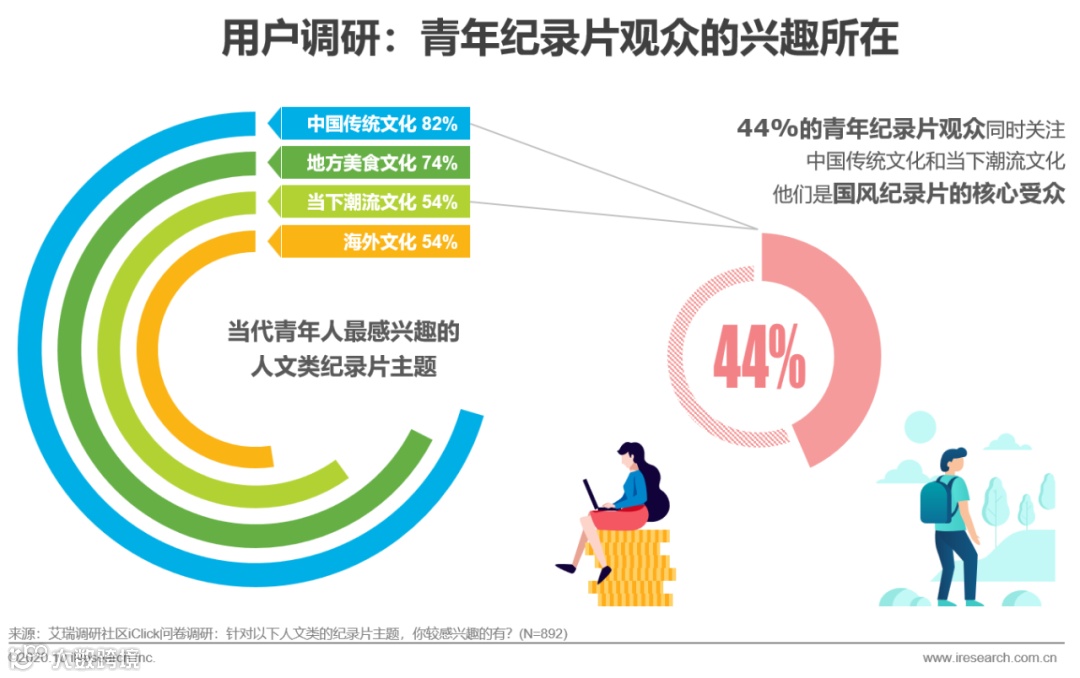 调研显示,青年最感兴趣的纪录片主题包括中国传统文化、地方美食、潮流文化与海外文化,其中44%同时关注传统文化与潮流文化,构成国风纪录片的核心受众。