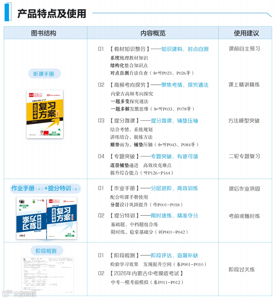 根据一线教学需求,新增5套阶段检测卷和1套摸底试卷,阶段评估,查漏补缺,助力考生及时发现问题,不断提升。