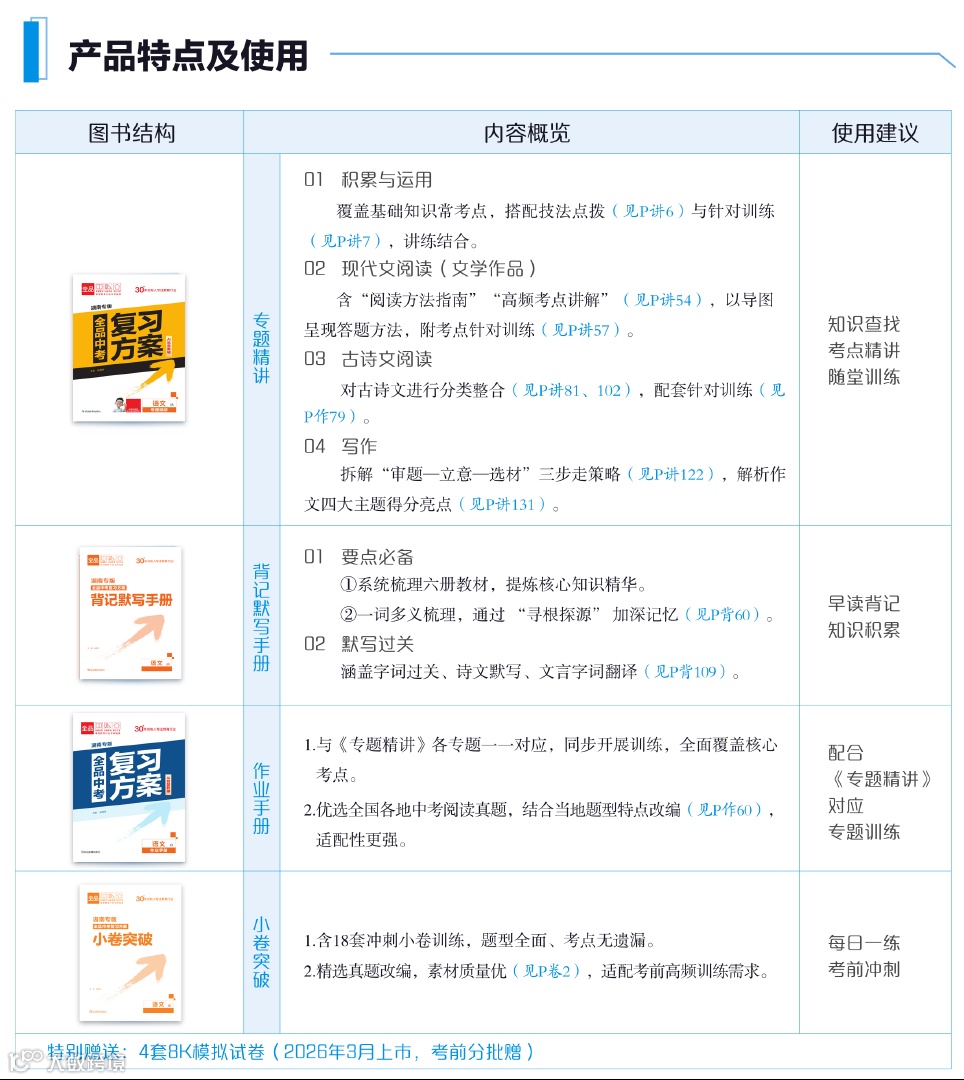 《作业手册》与《专题精讲》各专题一一对应,同步开展训练,全面覆盖核心考点。精选全国各地中考真题,结合当地题型进行精准改编,与本地中考需求高度适配。