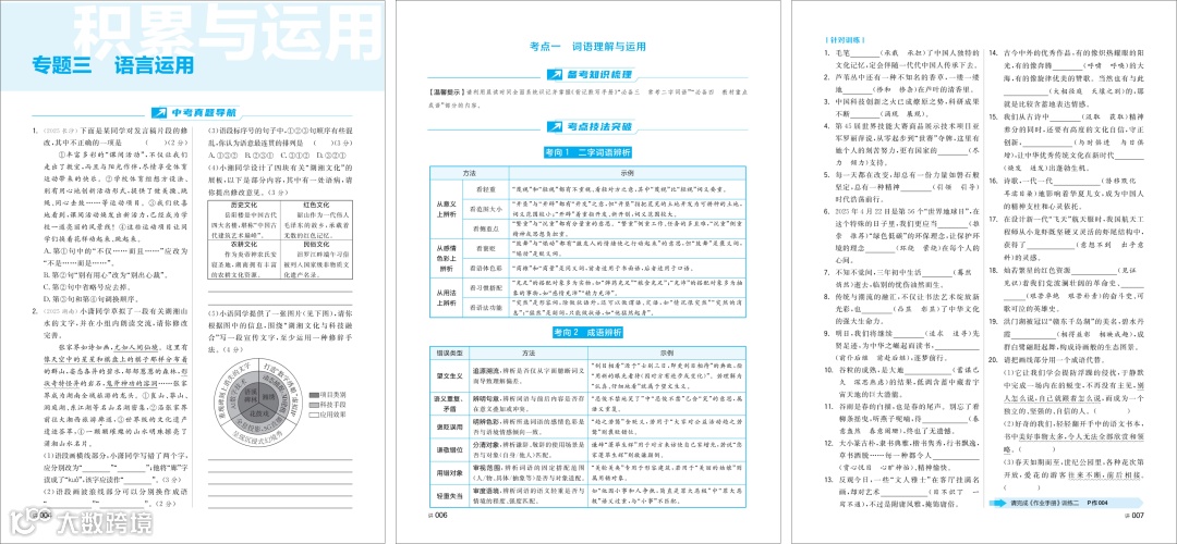 《专题精讲》积累与运用板块,涵盖基础常考点,搭配技法点拨与针对训练,通过“先看真题、再总结方法、后随堂训练” 的闭环模式实现讲练结合,帮助学生快速吃透考点本质。