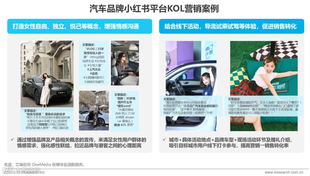 01 行业营销趋势 展示广告 · 2023年1-10月,汽车广告主信心稳定,展示广告投入达59.3亿元。3-5月为投放高峰,受市场“小阳春”效应推动。头部品牌投放趋于谨慎,东风本田、宝马新晋TOP15。移动与OTT端投放占比提升,“大尺寸”广告如长横幅、全屏、信息流广告更受青睐。汽车之家、易车、懂车帝等垂类平台为主要投放阵地。 综艺赞助 · 汽车品牌综艺植入需求上升,前10个月共28个品牌参与,4-8月为高峰期。单品牌单车型植入为主流模式,生活观察类节目仍是重点布局类型。网络综艺赞助比例提升,明星竞演与综合游戏类节目赞助效果更优,凯迪拉克《极限挑战第九季》表现突出。 02 营销策略升级 车企对“品效销三合一”需求增强,数字化营销成为主导。公域与私域协同发力,实现用户全生命周期价值挖掘。 公域渠道策略 · 垂类媒体:覆盖“看、买、用、换”购车全链路,依托用户行为数据实现精准触达。结合测评内容、优惠信息与线下试驾活动,提升转化效率。 · 视频平台:通过KOL种草、综艺/剧集赞助扩大品牌声量;官方账号与达人共创短视频及直播带货,促进销售转化。 · 社交媒体:小红书凭借高女性用户占比和强种草属性,成为女性消费群体沟通主阵地。品牌通过生活化场景内容、热门话题联动及线下活动,强化“自由、独立”情感认同,提升转化率。 私域渠道策略 · 车企借助公域流量入口拓展私域池,以APP、小程序为核心运营阵地,开展精细化用户运营。通过线上线下活动提升活跃度,结合定制化服务挖掘用户长期价值,并依托口碑传播触达更多潜在客户。 |