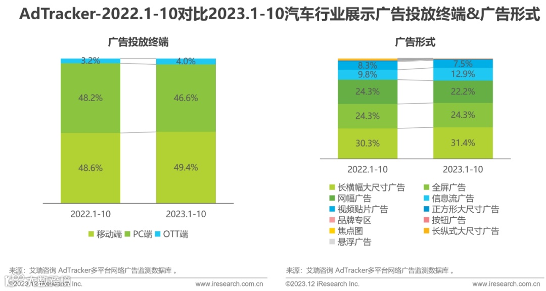 相比2022年,2023年汽车广告在移动端与OTT端投放比例有所上升。长横幅、全屏、网幅等大尺寸广告仍占主导地位,信息流广告投入占比提升3.1%。