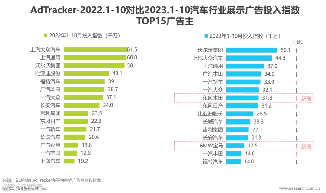 沃尔沃、上汽大众、上汽通用等TOP3厂商广告投入同比下滑,投放态度谨慎。东风本田、宝马新晋TOP15,13家厂商连续两年上榜,行业头部阵营整体稳定。