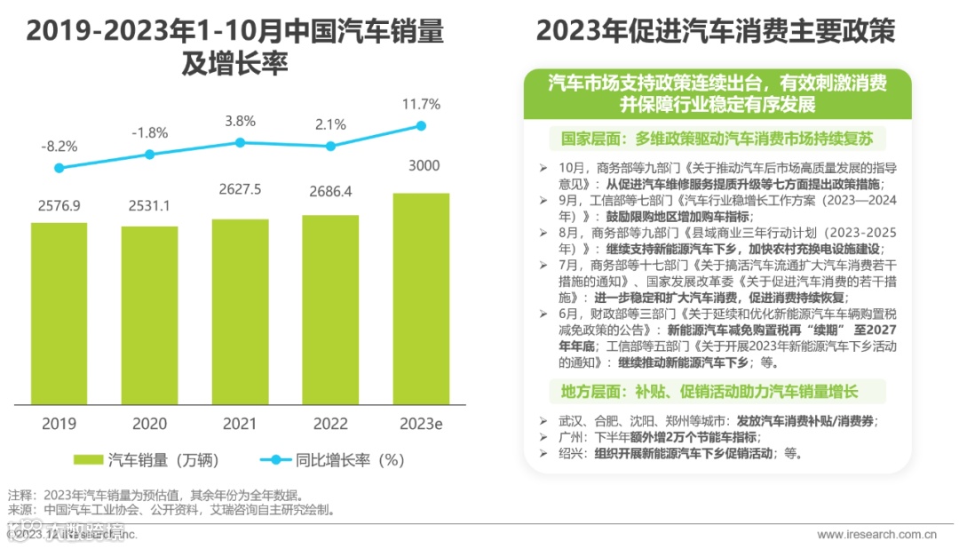 2023年,在宏观经济改善与疫情影响消退背景下,国内汽车市场稳步复苏。作为消费“四大金刚”之一,汽车行业受到政策密集支持,包括增加限购城市购车指标、延长新能源车购置税减免、发放消费补贴等,有效刺激消费需求,推动市场回暖。