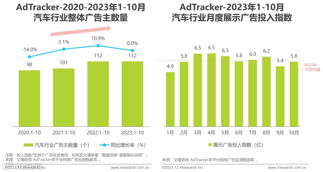 2023年1-10月,汽车行业广告主数量持平去年同期,整体展示广告投入达59.3亿元。3-5月月均投入超6亿元,显著高于前十月均值,呈现明显季节性增长特征。