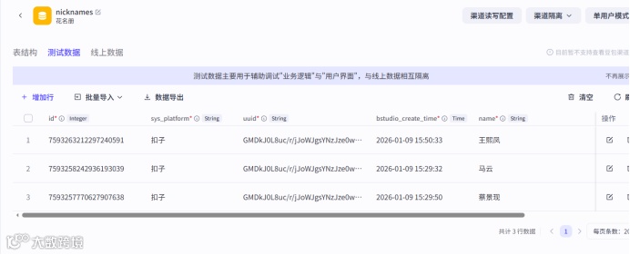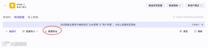 数据分为线上数据和测试数据,都支持手动添加和批量导入,如果表格中有数据,也是在这里查看。