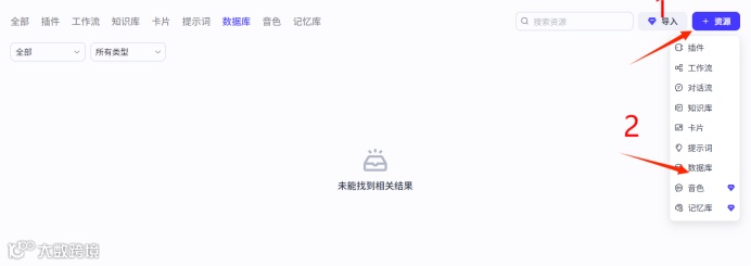 在资源库页面,点击“资源”按钮,选择“数据库”