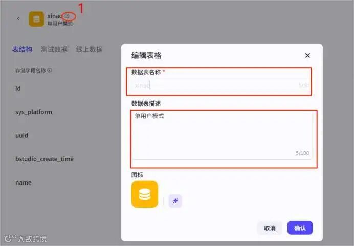 数据表名称不支持修改,描述和图标支持修改
