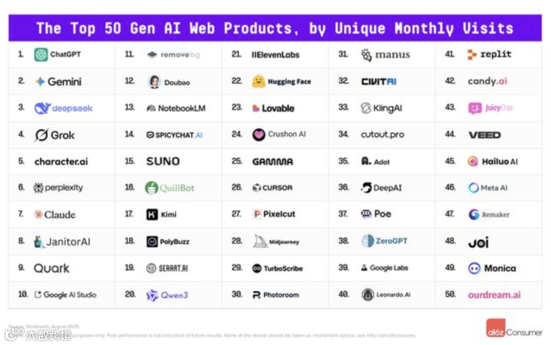 2025年是大模型重构用户体验的一年,在这一年里,国内头部AI团队也迎来了高光时刻,从2025年8月全球知名风险投资机构a16z基于过去两年多月度访问和月活用户发布的《全球Top 100生成式AI消费应用榜单》来看,在网页端和移动端TOP 50榜单中,分别有11款和22款国内产品上榜。