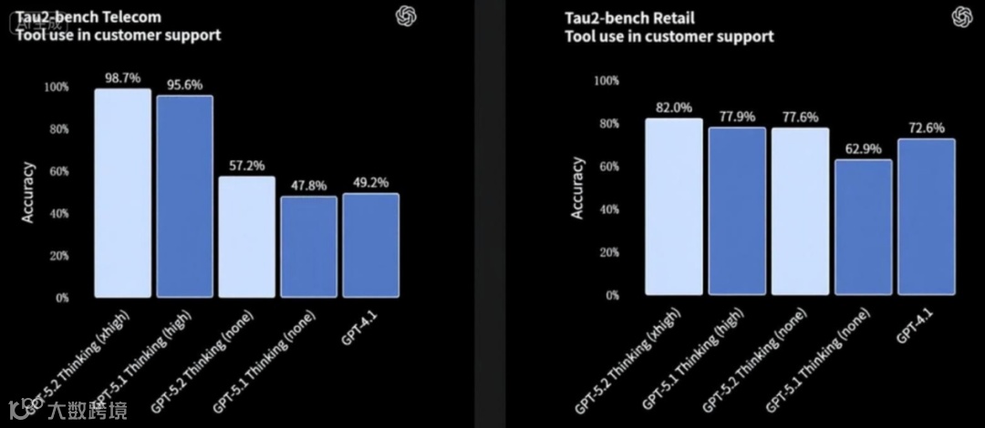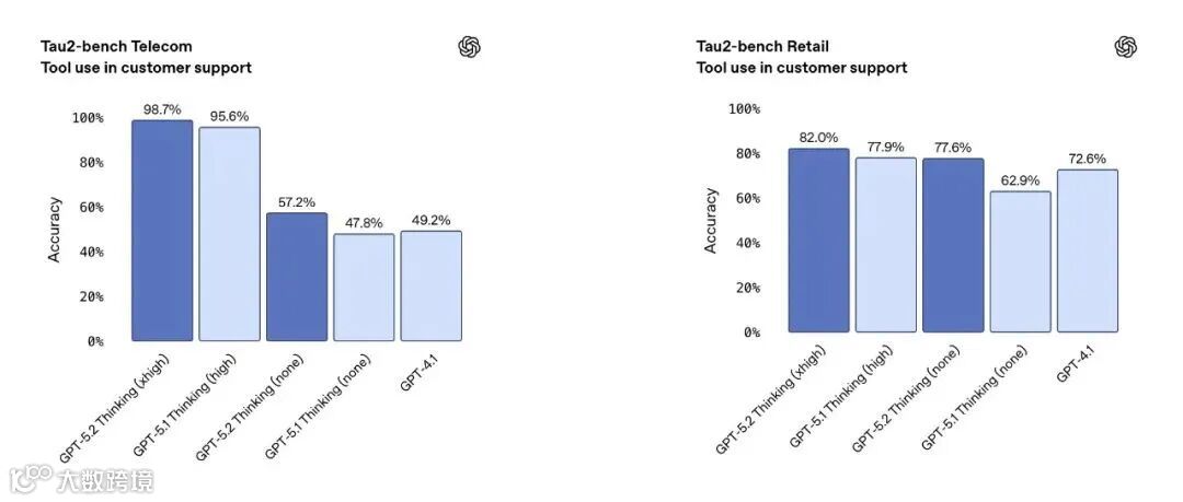 在企业工作流场景中,GPT-5.2展现出更强的工具调用能力。在Tau2-bench Telecom多轮客服任务测试中,新模型取得了98.7%的完成度,覆盖订票、退款、延误补偿等复杂场景。